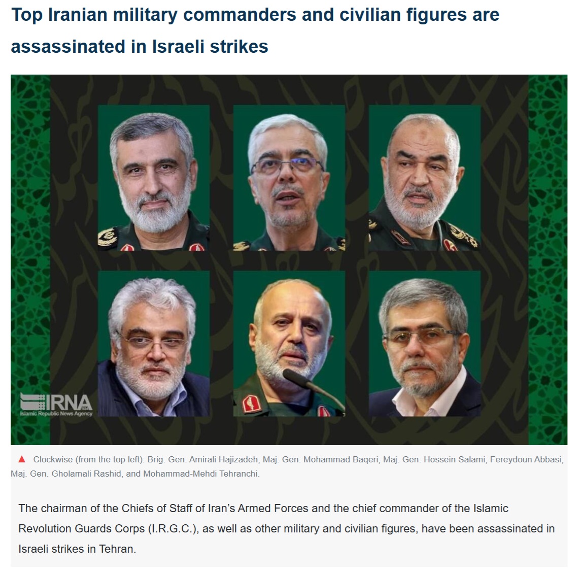 “Tehran, IRNA – Chairman of the Chiefs of Staff of Iran’s Armed Forces Major General Mohammad Baqeri, Chief Commander of the Islamic Revolution Guards Corps (I.R.G.C.) Major General Hossein Salami, and other military and civilian figures have been assassinated in Israeli strikes in Tehran. Major General Baqeri and Major General Salami were assassinated in separate Israeli strikes overnight on Friday. Commander of the Aerospace Force of the I.R.G.C. Brigadier General Amir Ali Hajizadeh was also assassinated in the Israeli strikes. Commander of Khatam al-Anbia Headquarters Major General Gholamali Rashid was also killed. Mohammad-Mehdi Tehranchi, a nuclear scientist and president of the Islamic Azad University, and Fereydoun Abbasi, also a nuclear scientist and former head of the Atomic Energy Organization of Iran were also killed in separate strikes.”